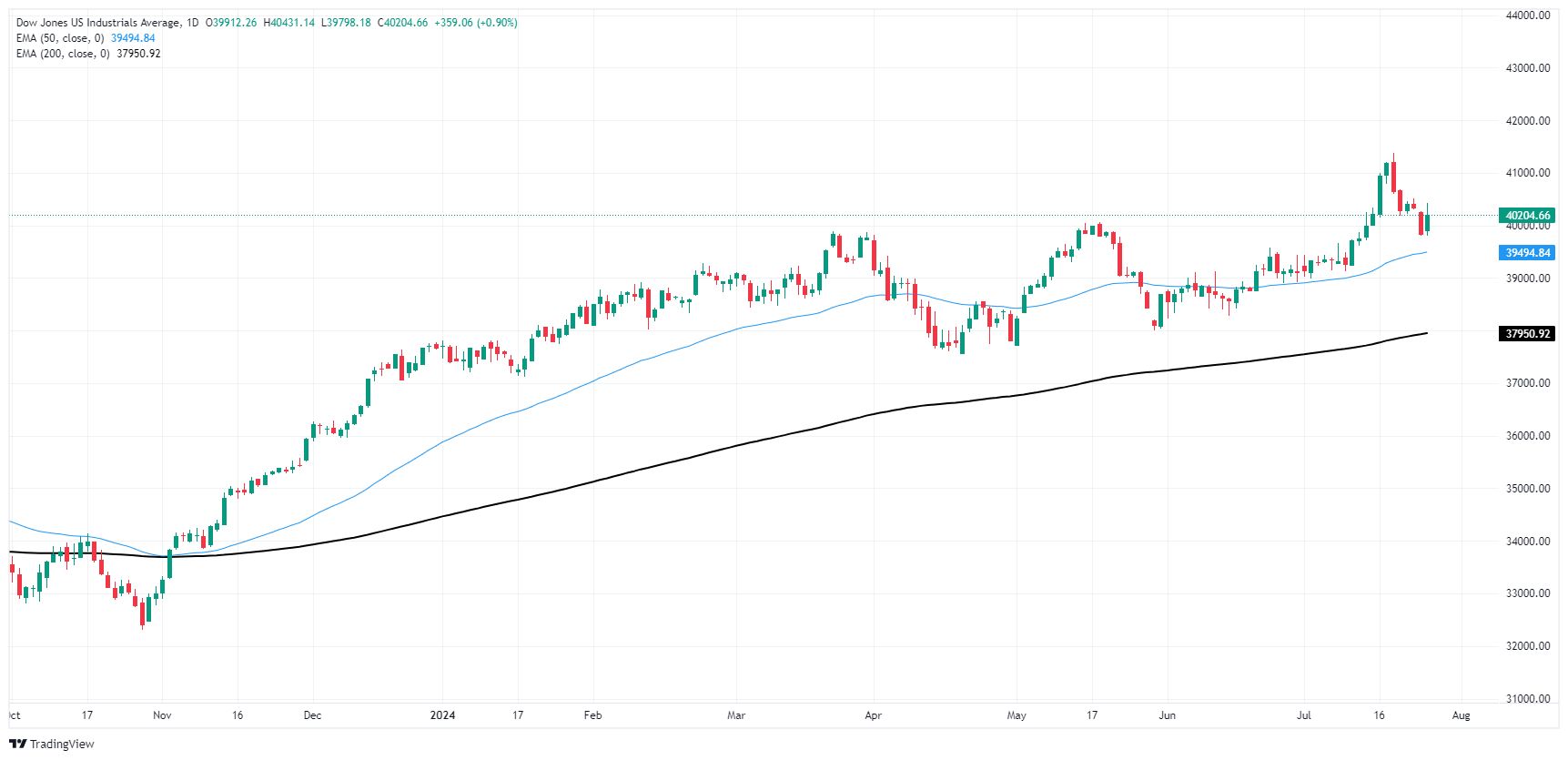 داده اقتصادی تولید ناخالص داخلی سه ماهه سالانه به 2.8 درصد برای سه ماهه دوم افزایش یافت که از انتظارات 2.0 درصد فراتر رفت و بر اساس رشد 1.4 درصدی سه ماهه قبل بود، این عملکرد قوی منجر به ارزیابی مجدد احتمال کاهش نرخ بهره فدرال رزرو در ماه سپتامبر شد و بازگشت از روند برای داوجونز اتفاق افتاد، اگرچه داده های متفاوت همچنان بر احساسات بازار تأثیر می گذارد.